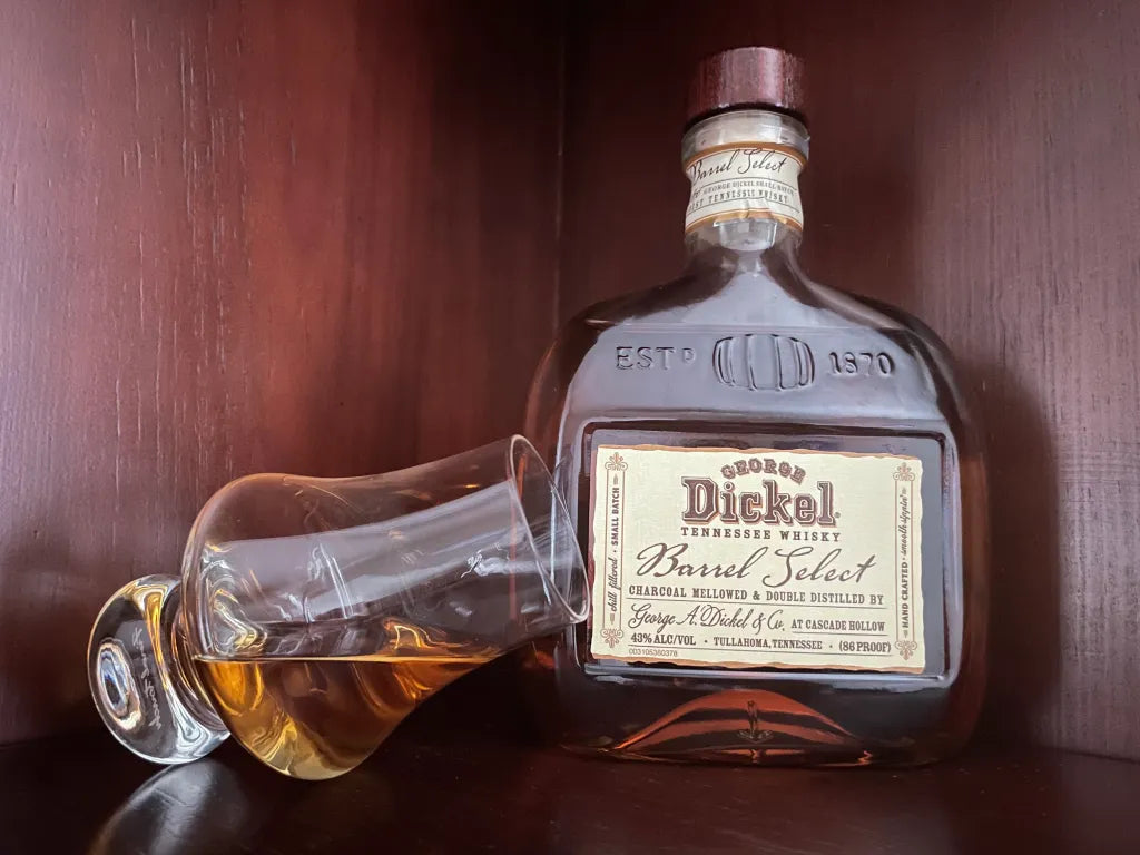 George Dickel Barrel Select Tennessee Whiskey is crafted with a meticulous barrel selection process. It undergoes the Lincoln County Process, a charcoal mellowing technique, and is then aged in handpicked barrels for a unique and nuanced flavor profile.